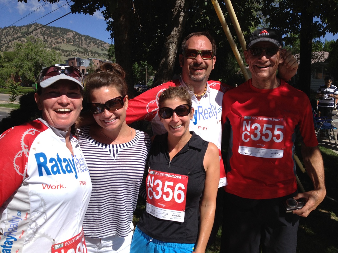 I would have raced this year but my Olympic aspirations depend on me avoiding activities that require running (or any other exertion of energy) before 9:30 am on holidays…especially when 50,000 Boulderites are involved. L-R Erin, Spice, Janice, Chris Ratay & Peter Whatshisname.